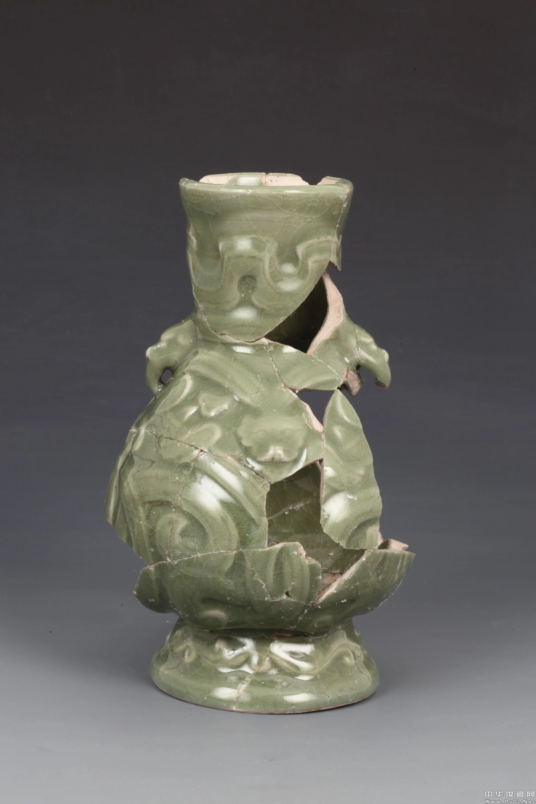 高30厘米,底径18厘米。母口,外口略高于内口,外口沿呈锯齿状花口,器表模印三层仰莲,部分标本莲瓣上饰乳钉状花蕊,柄部为圆柱形,伸出三个兽首,底座呈荷叶状上卷,轻盈灵动,接地面刮釉垫烧。亦发现了配套熏炉盖,其中鸳鸯形盖最为完整,上卧一只鸳鸯,嘴巴微张作为出烟口,盖座呈莲蓬状,葵沿,直壁,盖底刮釉垫烧。
