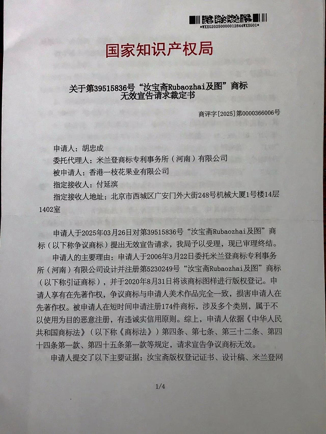 据悉,本案申请人为河南汝宝斋瓷业有限公司商标实际持有人胡忠成。2025年3月26日,胡忠成就香港一枝花果业有限公司注册的第39515836号“汝宝斋Rubaozhai及图”商标(下称“争议商标”),向国家知识产权局提出无效宣告申请,该局依法予以受理,案件编号为商评字[2025]第000366006号。